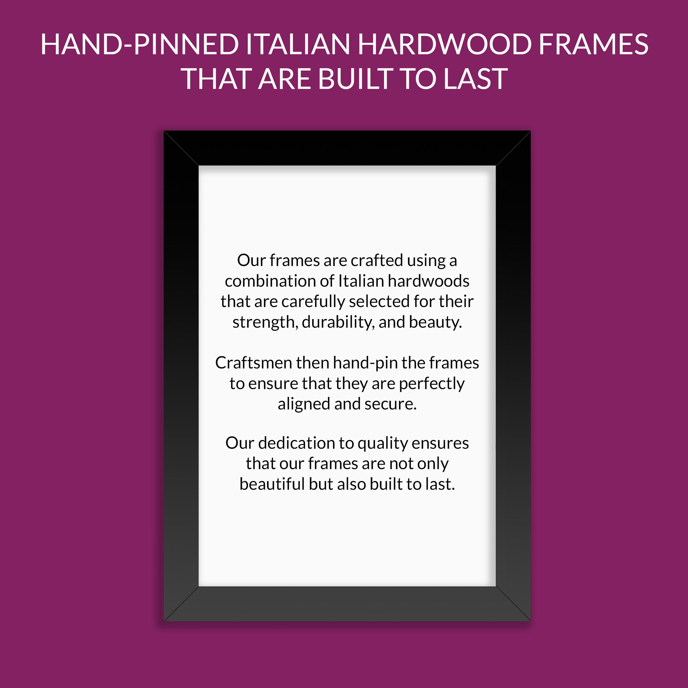 Our frames are handmade from Italian woodgrain mouldings, chosen for their strength, durability, and timeless look. Each one includes a built-in stand for easy display on a shelf or desk, as well as a hook for wall hanging. Every frame is hand-finished and fitted with crystal-clear acrylic glass to protect your print while keeping every detail beautifully visible.